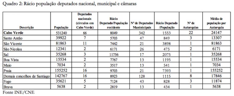 Ter, pois, a pretensão de corrigir as assimetrias socioeconómicas, quer mediante a criação de regiões supostamente administrativas quer através da profusão de ministérios por diversas ilhas, com poderes político-administrativos para alegadamente criar riqueza mais próxima das pessoas, é das últimas invenções de segmentos da nossa classe política historicamente “dependente do Estado”. Aliás, os dados existentes contrariam essa premissa. Senão vejamos: os espaços geográficos/ilhas mais pobres de Cabo Verde são aqueles onde existe maior número de autarquias, maior número de deputados municipal e nacional por habitante. A título ilustrativo, a ilha de São Nicolau dispõe de um deputado nacional por cada 6171 habitantes, uma autarquia para cada 6071 residentes, um deputado municipal para cada 475 pessoas. A ilha de Santo Antão possui um deputado nacional para cada 5703 residentes, um município para cada 13307 almas e um deputado municipal para cada 849 pessoas. A mesma tendência prevalece nas ilhas do Fogo e nos demais concelhos de Santiago, conforme o Quadro 2. Por isso, não é pela criação de mais autarquias supramunicipais, uma espécie de “câmara municipal” acima das atuais, que se combate os crónicos problemas de criação e distribuição da riqueza e muito menos a redução da demografia de algumas ilhas. Tanto é assim que as ilhas do Sal e da Boa Vista ostentam grande vitalidade económica sem que se tenha expandido o Estado e, com efeito, o mercado político.