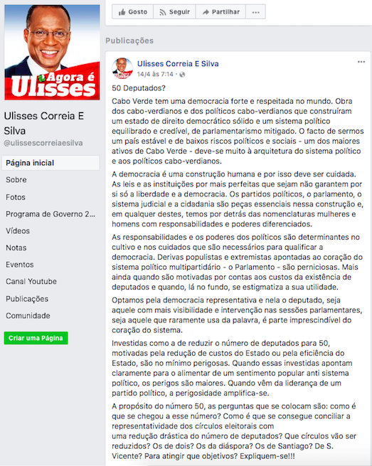 Manifestando-se incomodado, Ulisses Correia e Silva, termina o seu post, com as seguintes questões: “A propósito do número 50, as perguntas que se colocam são: como é que se chegou a esse número? Como é que se consegue conciliar a representatividade dos círculos eleitorais com uma redução drástica do número de deputados? Que círculos vão ser reduzidos? Os de dois? Os da diáspora? Os de Santiago? De São Vicente? Para atingir que objectivos? Expliquem-se!!!”